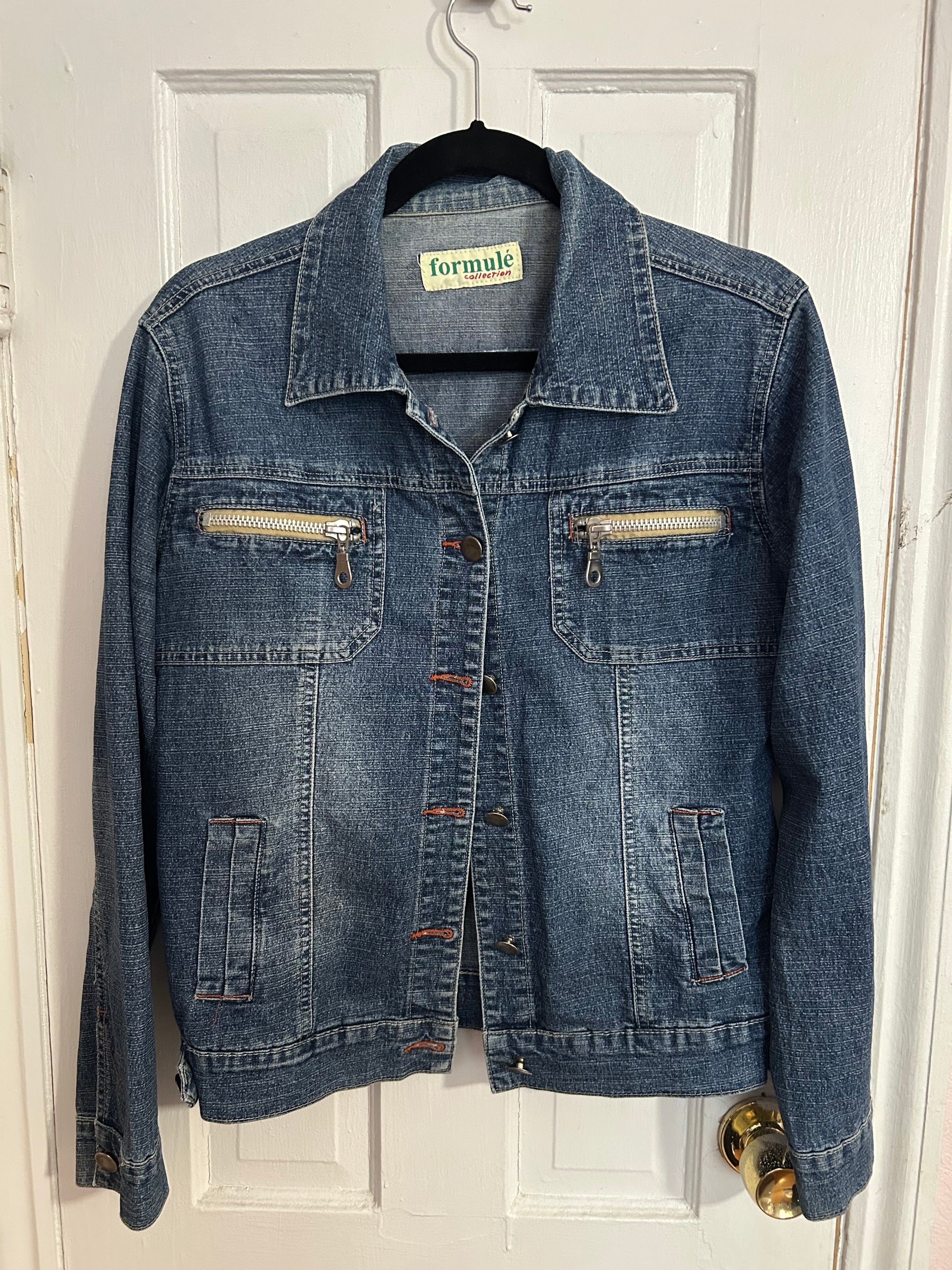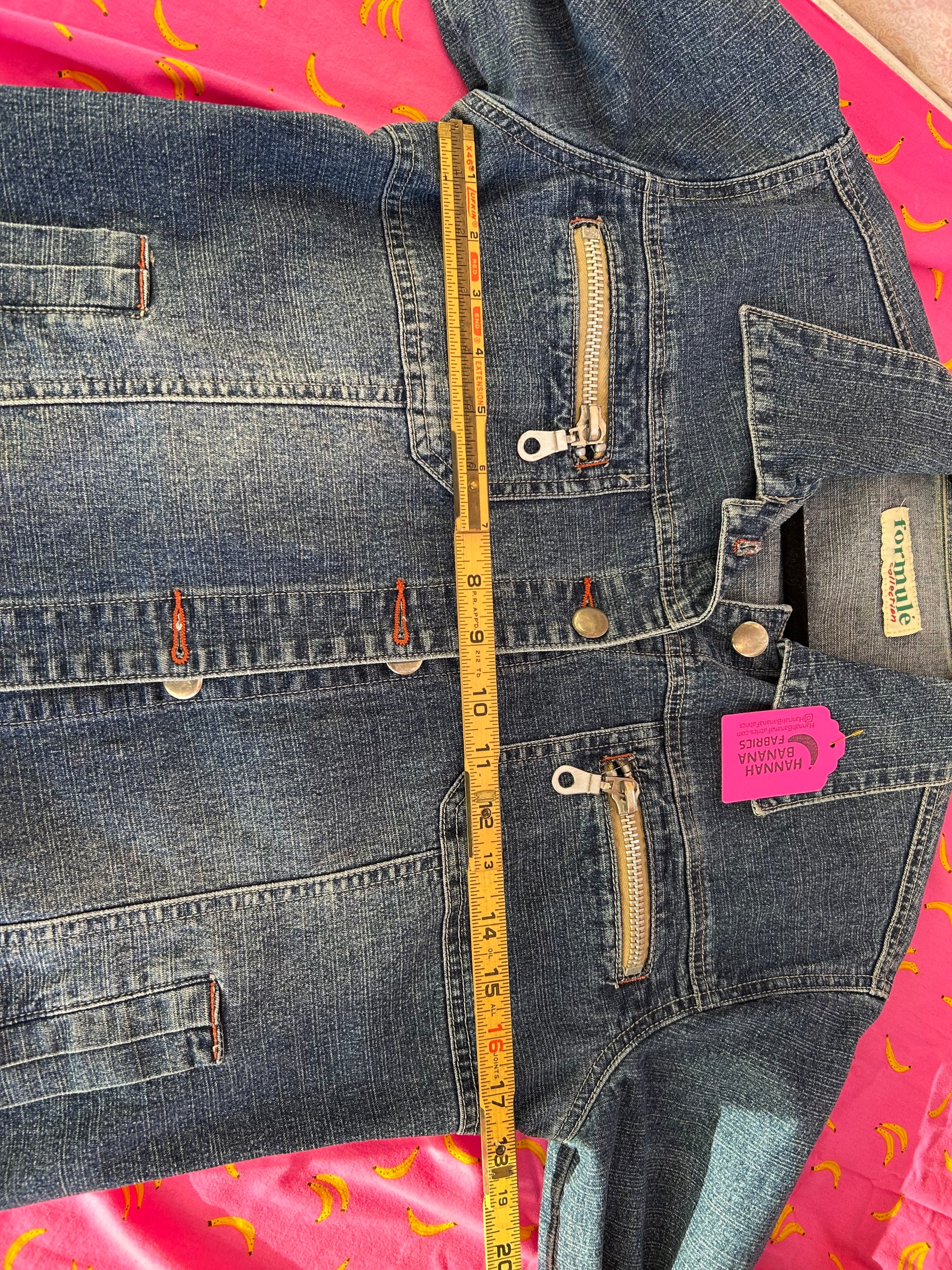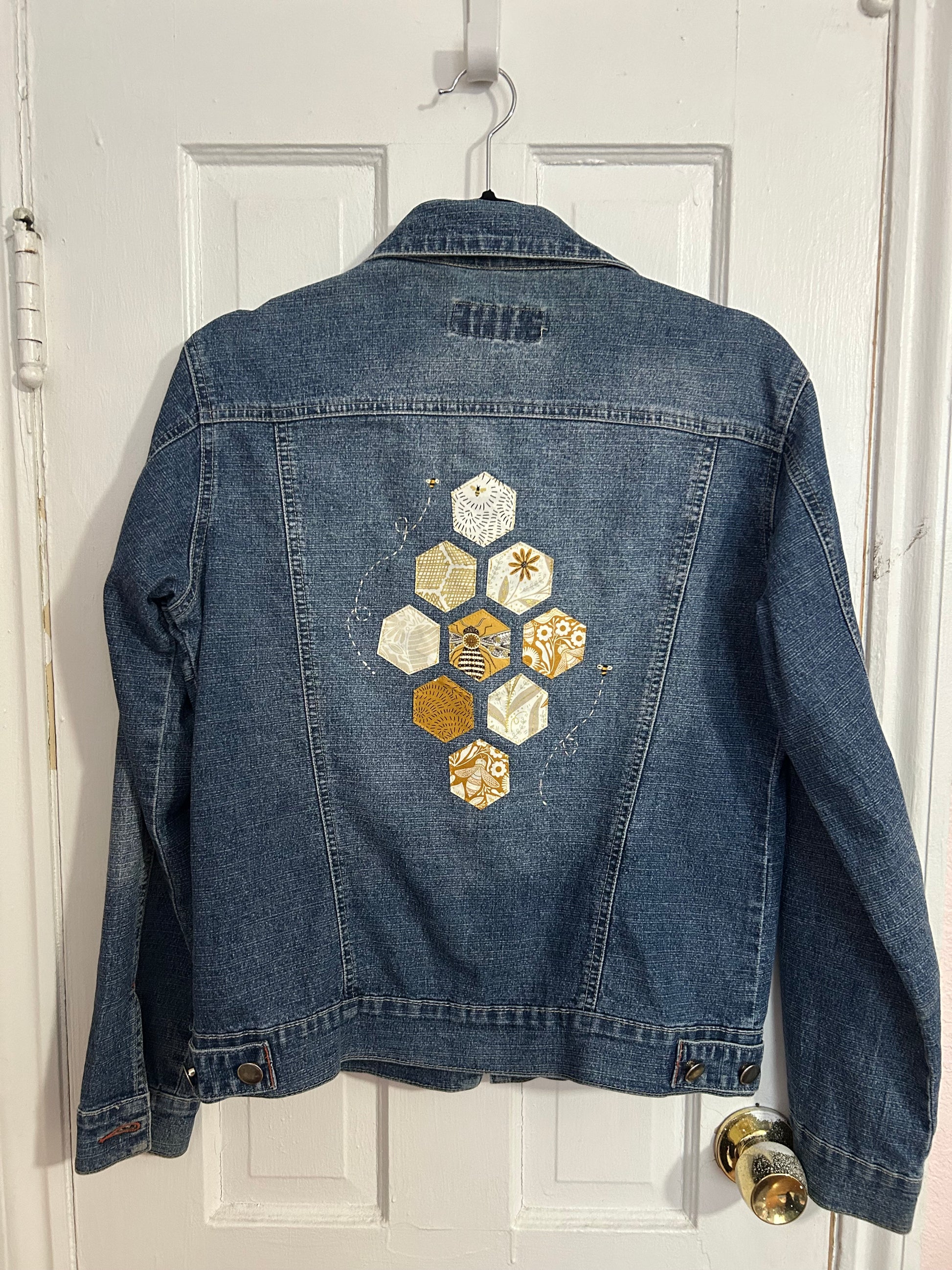 Decorated denim jacket, with appliquéd hexagons and hand-embroidered bees on the back! No size tags, measures a medium. 17 1/2” from armpit to armpit.